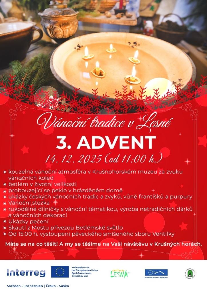 Zveme vás na třetí adventní neděli na akci Advent na Lesné, kde se můžete těšit na betlém v životní velikosti a ukázku českých tradic a zvyků. Skauti z Mostu přivezou betlémské světlo, které symbolizuje mír a naději. Program začne v 15:00 vystoupením pěveckého smíšeného sboru Ventilky, který přispěje k slavnostní atmosféře. Přijďte s námi oslavit toto krásné období a zavzpomínat na tradice, které nás spojují.