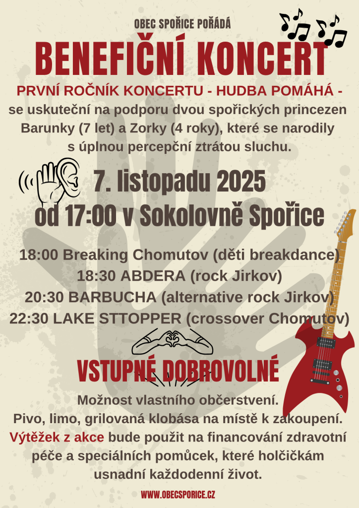 Srdečně vás zveme na první ročník benefičního koncertu, který se uskuteční na podporu dvou spořických princezen – Barunky (7 let) a Zorky (4 roky). Obě dívky trpí úplnou percepční ztrátou sluchu.